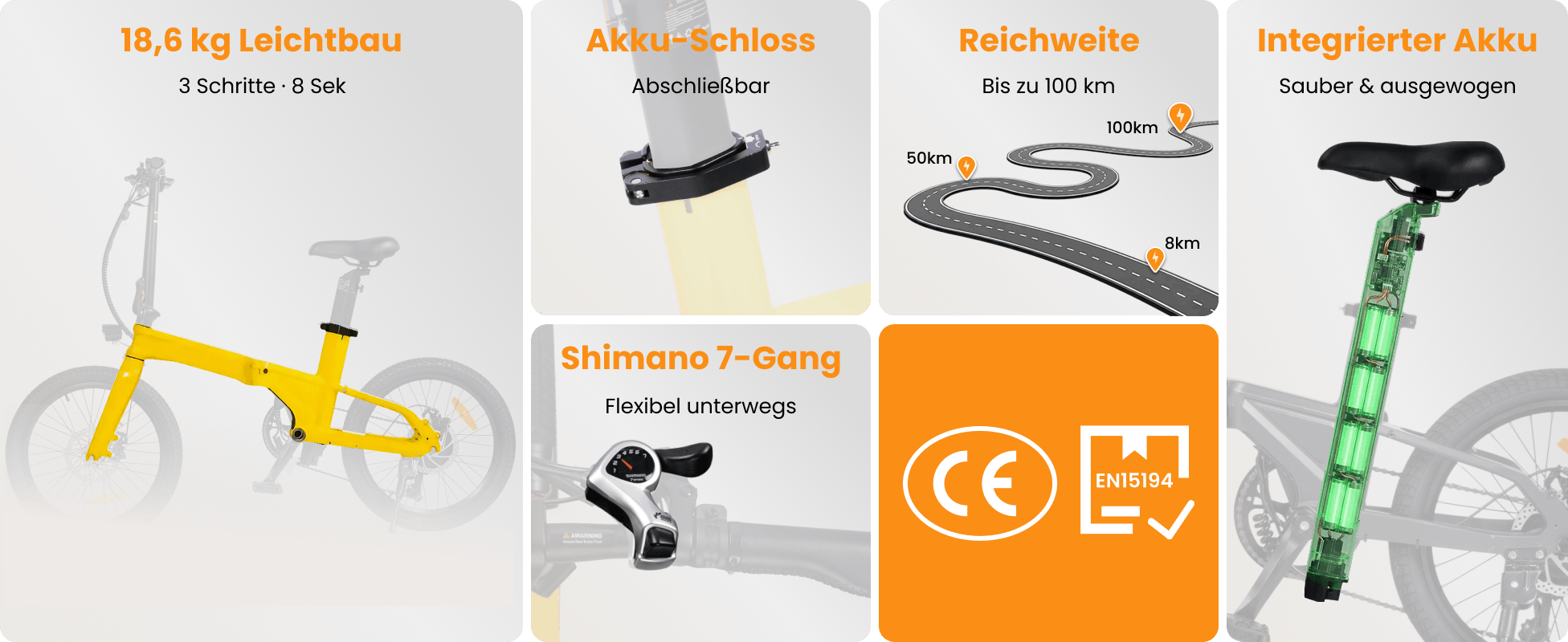 „Ultraleichte 20-Zoll-Präzision vereint kraftvolle Fahrdynamik mit einem nahtlosen 8-Sekunden-Faltsystem für grenzenlose Mobilität.“
